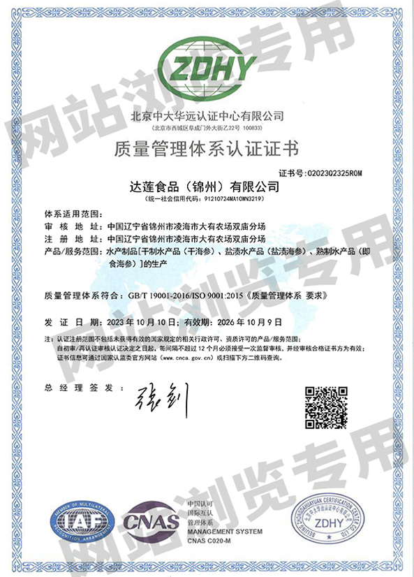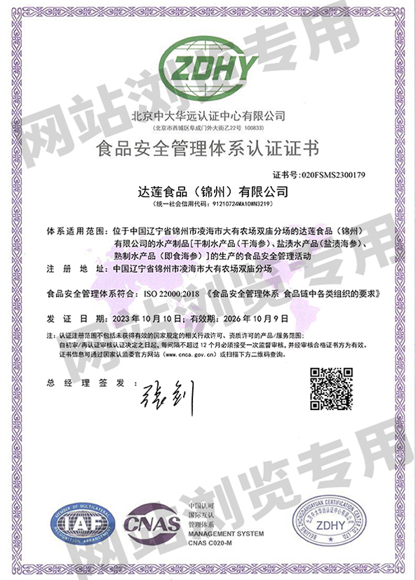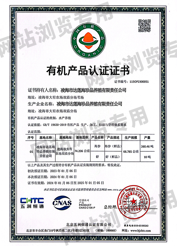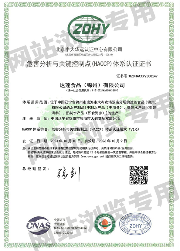 達蓮公司的遼參產(chǎn)品通過養(yǎng)殖、加工雙有機產(chǎn)品認(rèn)證、遼參認(rèn)證、ISO9001質(zhì)量管理體系要求認(rèn)證ISO22000食品安全管理體系、食品鏈中各類組織的要求認(rèn)證、HACCP危險分析與關(guān)鍵控制點認(rèn)證等。